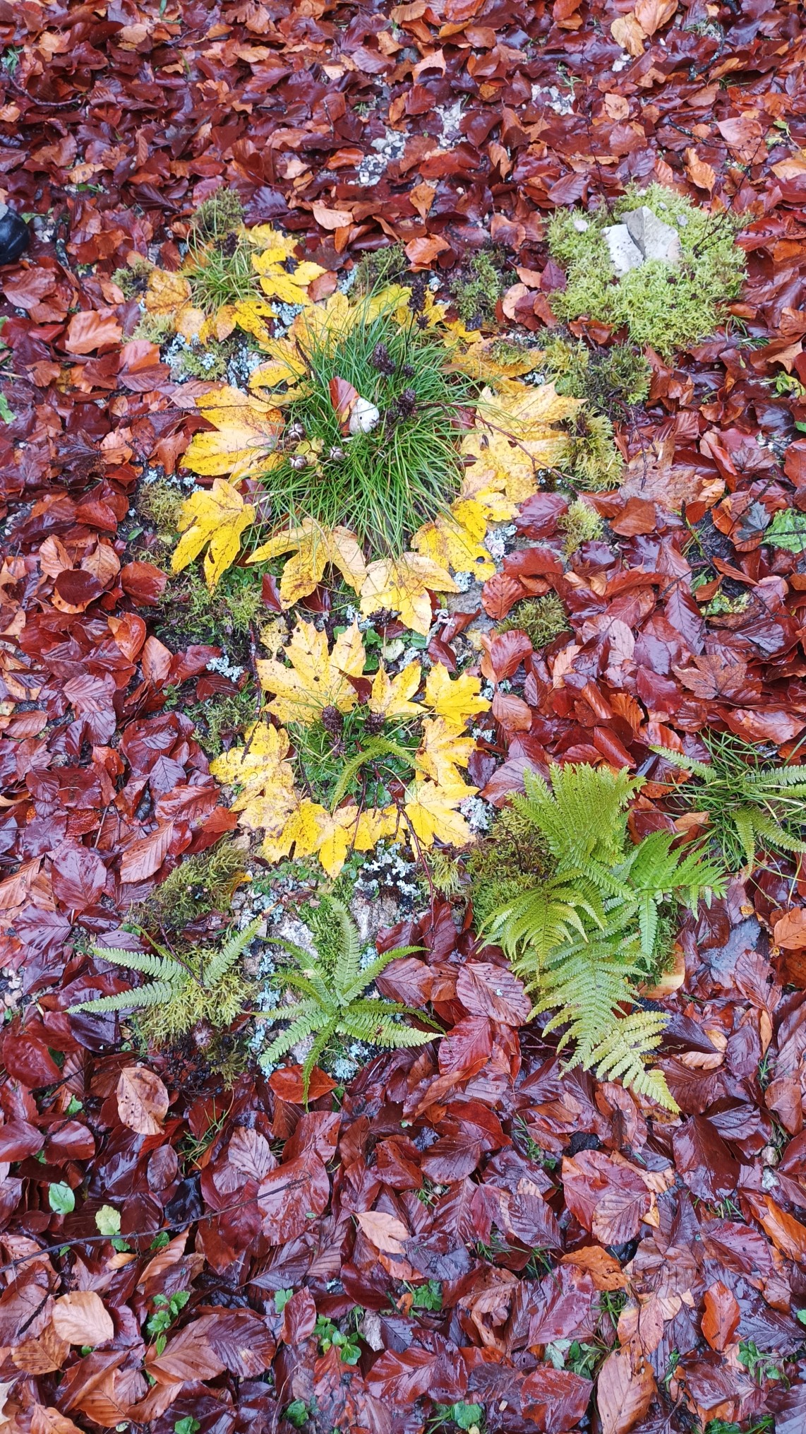 Wir sammelten eifrig Blätter, Moos, Stöcke und Steine für Naturbilder oder Naturmandala. Es entstand eine Sonnenblume, eine Inselgruppe mit verschiedenen Lebensräumen und ein Igel im Winterquartier.