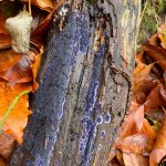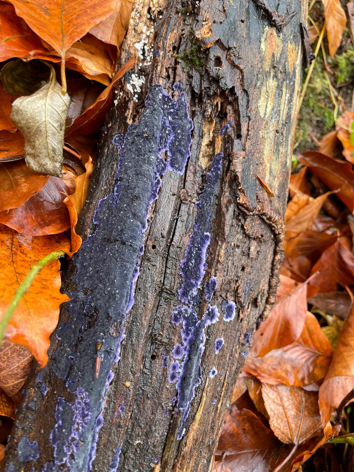 Unterwegs schmückten wir noch ein laubloses Gestrüpp und fast am Ende des Weges entdeckten wir noch einen kobaltblauen Rindenpilz.