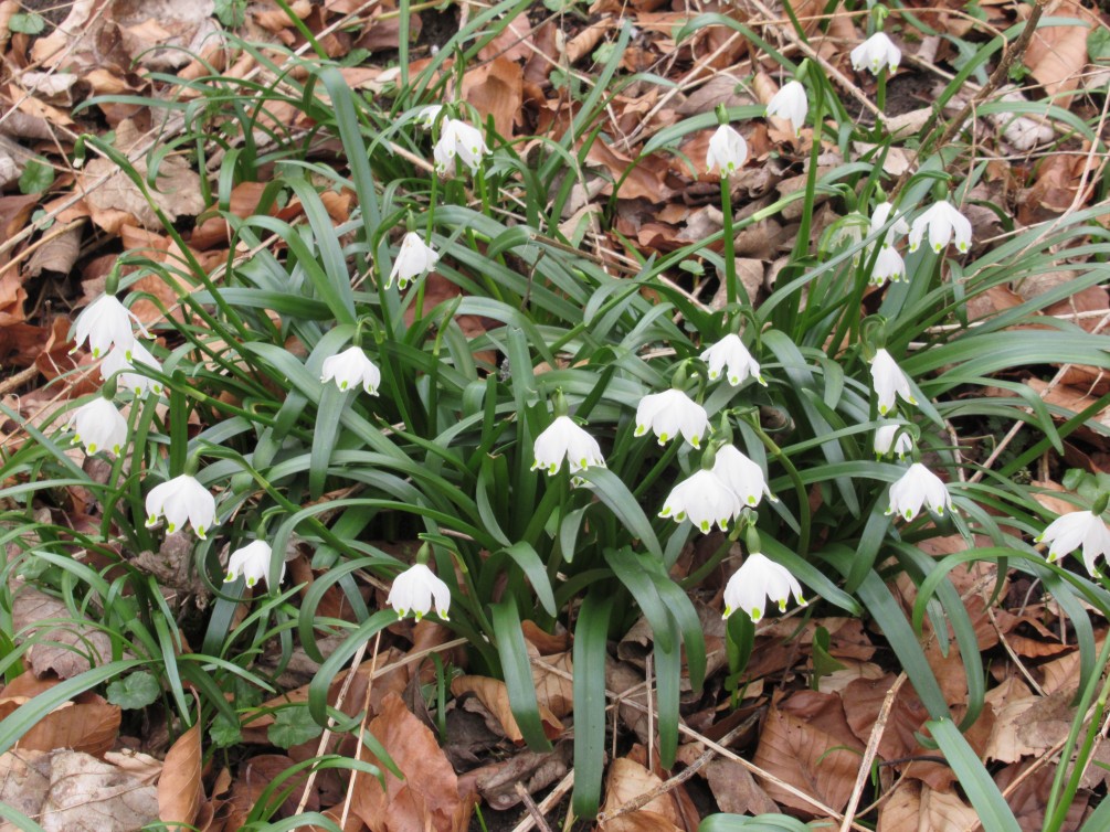 Auf einem guten geschotterten Waldweg, wandern wir auf halber Höhe, auf der anderen Talseite zurück zum Parkplatz. Unterwegs sehen wir noch eine größere Fläche mit Märzenbechern und manche andere schönen Dinge. Eine Schlusseinkehr ist vorgesehen.